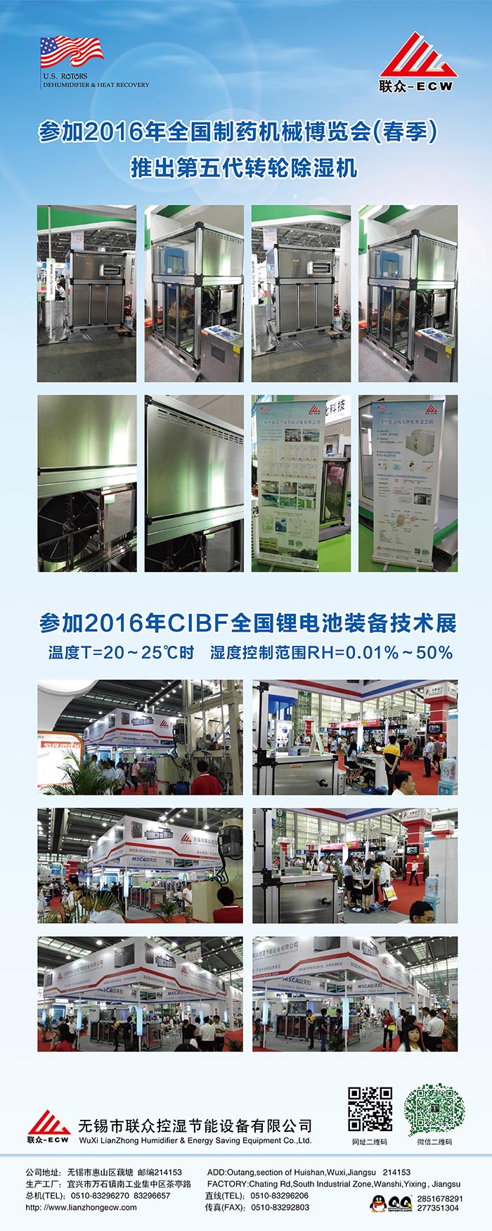 無錫市聯眾控濕節能設備有限公司成立于2004年2月,是一家長期致力于把空氣吸附分離技術應用于空氣處理設備的科技型中外合作 企業,主要研發生產轉輪除濕機組、熱泵除濕機組、空氣與空氣熱 能交換回收機組、蒸發冷卻空調機組、有機廢氣凈化處理機組等非 標空氣處理設備。隨著生產規模的不斷壯大和產業化的精細分工, 聯眾公司與2011年10月在江蘇省宜興市萬石鎮工業園茶亭路8號, 一期投資5000萬元,置地25畝、建標準工業廠房10000平方米和辦 公樓3000平方米,重新注冊成立江蘇聯眾聯勝節能設備有限公司。 企業領導層決定確立江蘇聯眾聯勝公司以研發生產蒸發冷卻空調機 組、有機廢氣凈化處理機組等大型節能環保空氣處理設備為主;而無錫聯眾控濕公司則在無錫繼續以研發生產轉輪除濕機組、熱泵除濕機組、空氣與空氣熱交器為主。在國內暖通空調工程領域,聯眾控濕公司研發各類轉輪除濕機的技術能力、生產各類轉輪除濕機的 裝備制造工藝水平處于本行業前沿。